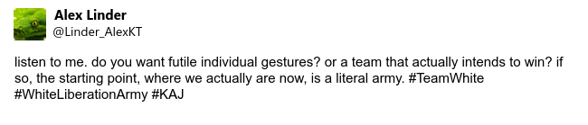2020-06-16 07:15 AM "listen to me. do you want futile individual gestures? or a team that actually intends to win? if so, the starting point, where we actually are now, is a literal army. #TeamWhite#WhiteLiberationArmy#KAJ"- Alex Linder